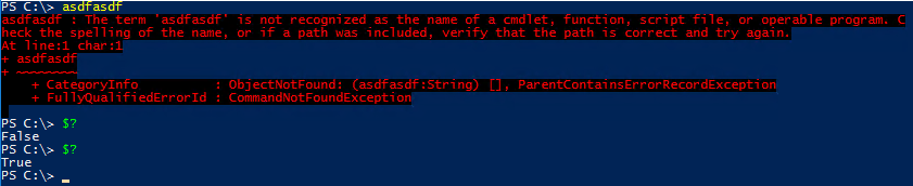 So inPowershell we test executing something that will nor work. and then check $? to see what happens.